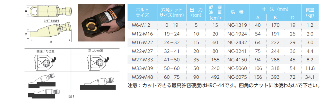 頑固に固着したナットをボルトを付けずに素早く切断。 ・錆びたナットを安全に素早く取り除くことができます。 ・M6~M48までのボルトサイズに対応できます。 ・シリンダは単動スプリングターン、独自の角度付きヘッド型です。 ・強力なたがね(刃)は再研磨可能です。 ・すべてのモデルは、油圧ポンプが必要になります。