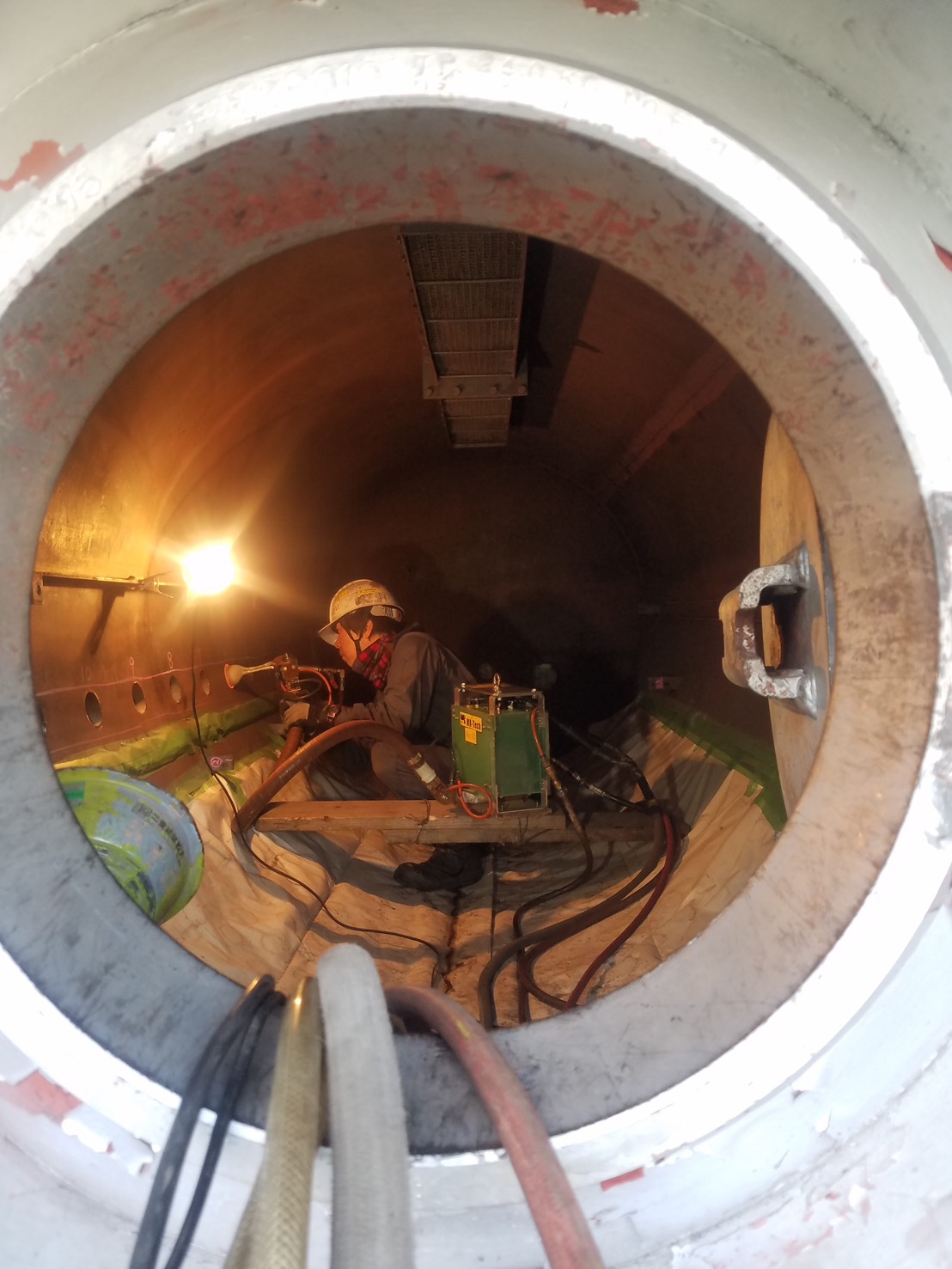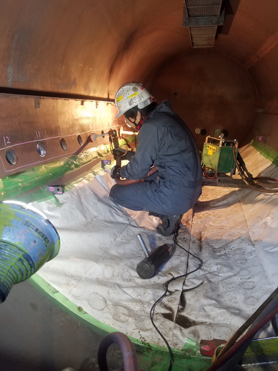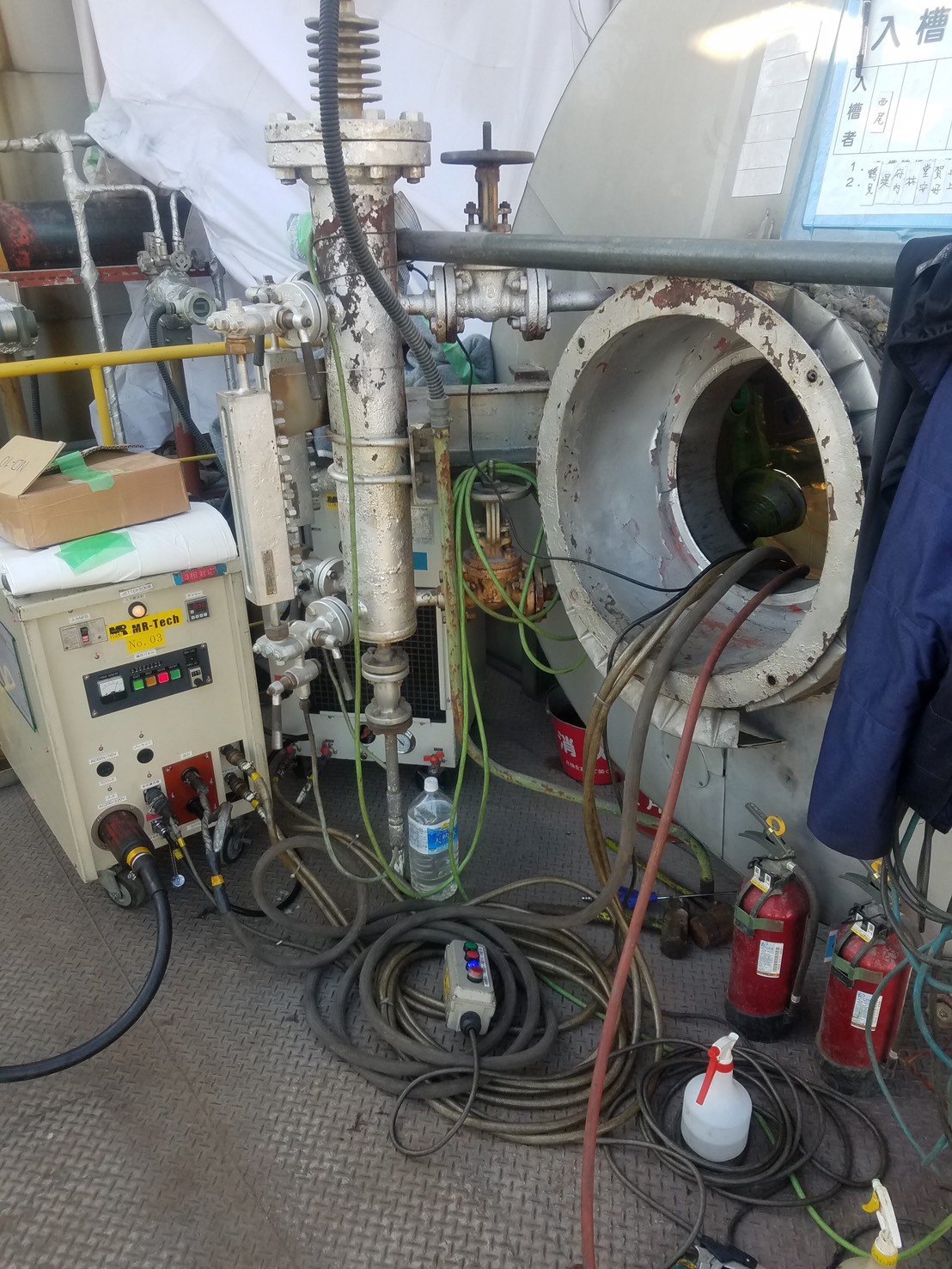 従来のボルトヒーター、ガス過熱に比べ、作業性と安全性に優れている高周波ボルトヒーターを使用した施工を行います。弊社で使用している高周波ボルトヒーターでは安全向上、時間短縮は元より、これまでの方式で苦労したボルト作業、チェーンブロック+ハンマーリングよりも確実な施工が可能です。 高周波電源を使用したボルトの締め・ゆるめ作業 弊社の高周波ボルトヒーターは導入も簡単!初めての現場でも下見の上、弊社社員が直接作業します。