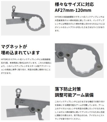 ボルト締結作業において一般的な怪我のひとつは反力受けまたはバックアップレンチで指が挟まれる事です。ハイトーク製のマグネット式バックアップレンチはナットの供回りを防止するためのハンズフリーソリューションを提供し、怪我のリスクを軽減します。
